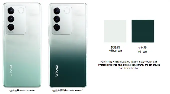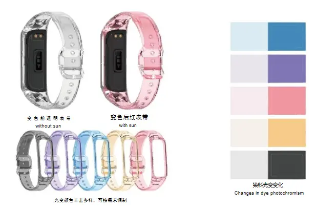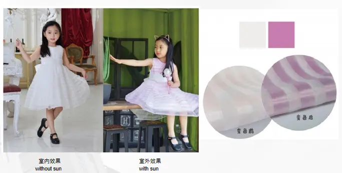 Bahan photochromic adalah bahan serbuk photochromic yang dihasilkan dengan membungkus pewarna fotochromic dalam microcapsules melalui proses khas, yang dapat menyerap tenaga cahaya matahari (ultraviolet) setelah disalurkan oleh cahaya matahari (ultraviolet) Apabila cahaya matahari (ultraviolet) tenaga hilang, ia kembali ke struktur molekul asalnya dan mengembalikan warna asalnya. Ciri: